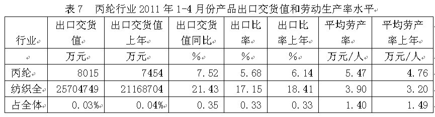 從行業(yè)產(chǎn)品出口交貨值和勞動(dòng)生產(chǎn)率水平看,2011年1-4月份丙綸行業(yè)產(chǎn)品出口交貨值為0.80億元,占紡織全行業(yè)的0.03%;出口交貨值比上年同期增加7.52%;該行業(yè)產(chǎn)品出口比率(出口交貨值/工業(yè)銷售產(chǎn)值)為5.68%,而上年同期為6.14%,表明該行業(yè)產(chǎn)品出口狀況較好;從勞動(dòng)生產(chǎn)率的水平看,2011年1-4月份丙綸行業(yè)平均勞產(chǎn)率(工業(yè)增加值/從業(yè)人數(shù))為5.47萬(wàn)元/人,而上年同期為4.76萬(wàn)元/人,表明該行業(yè)勞動(dòng)生產(chǎn)率的實(shí)際水平較為理想。
