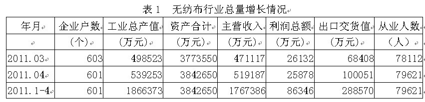 據(jù)國(guó)家統(tǒng)計(jì)局公布的數(shù)據(jù),2011年1-4月份我國(guó)規(guī)模以上無(wú)紡布行業(yè)企業(yè)數(shù)量為601家,該行業(yè)實(shí)現(xiàn)工業(yè)總產(chǎn)值186.64億元,同比增加29.38%;資產(chǎn)合計(jì)384.27億元,同比增加21.53%;實(shí)現(xiàn)主營(yíng)收入176.74億元,同比增加29.72%;完成利潤(rùn)總額8.63億元,比上年同期增加2.06億元,同比增加31.36%;完成出口交貨值28.9億元,同比增加29.48%;行業(yè)整體從業(yè)人數(shù)7.96萬(wàn)人,同比增加8.47%。由此可見(jiàn),無(wú)紡布行業(yè)總量增長(zhǎng)勢(shì)頭良好,并為我國(guó)經(jīng)濟(jì)、財(cái)政、出口和就業(yè)作出了重大的貢獻(xiàn)。