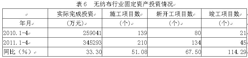 據(jù)國(guó)家統(tǒng)計(jì)局公布的數(shù)據(jù),2011年1-4月份無(wú)紡布行業(yè)實(shí)際完成投資額34.53億元,同比增加33.30%;當(dāng)年以來(lái)到目前為止施工項(xiàng)目總數(shù)為210個(gè),同比增加51.08%;其中新開(kāi)工項(xiàng)目數(shù)134個(gè),同比增加67.50%;截至4月底為止,已實(shí)現(xiàn)竣工項(xiàng)目數(shù)45個(gè),同比增加114.29%,占施工項(xiàng)目總數(shù)的21.43%,表明該行業(yè)投資項(xiàng)目進(jìn)展較好。