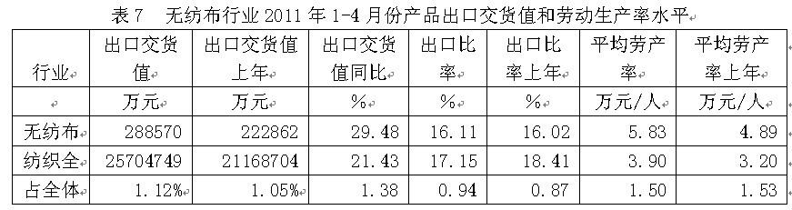 從行業(yè)產(chǎn)品出口交貨值和勞動(dòng)生產(chǎn)率水平看,2011年1-4月份無(wú)紡布行業(yè)產(chǎn)品出口交貨值為28.86億元,占紡織全行業(yè)的1.12%;出口交貨值比上年同期增加29.48%;該行業(yè)產(chǎn)品出口比率(出口交貨值/工業(yè)銷售產(chǎn)值)為16.11%,而上年同期為16.02%,表明該行業(yè)產(chǎn)品出口狀況較好;從勞動(dòng)生產(chǎn)率的水平看,2011年1-4月份無(wú)紡布行業(yè)平均勞產(chǎn)率(工業(yè)增加值/從業(yè)人數(shù))為5.83萬(wàn)元/人,而上年同期為4.89萬(wàn)元/人,表明該行業(yè)勞動(dòng)生產(chǎn)率的實(shí)際水平較為理想。