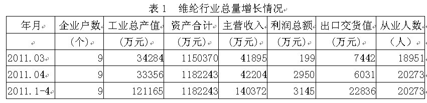 據(jù)國家統(tǒng)計(jì)局公布的數(shù)據(jù),2011年1-4月份我國規(guī)模以上維綸行業(yè)企業(yè)數(shù)量為9家,該行業(yè)實(shí)現(xiàn)工業(yè)總產(chǎn)值12.12億元,同比增加18.87%;資產(chǎn)合計(jì)118.22億元,同比增加16.83%;實(shí)現(xiàn)主營收入14.04億元,同比增加35.37%;完成利潤總額0.31億元,比上年同期增加0.10億元,同比增加44.34%;完成出口交貨值2.28億元,同比增加19.16%;行業(yè)整體從業(yè)人數(shù)2.03萬人,同比增加3.87%。由此可見,維綸行業(yè)總量增長勢頭良好,并為我國經(jīng)濟(jì)、財(cái)政、出口和就業(yè)作出了重大的貢獻(xiàn)。