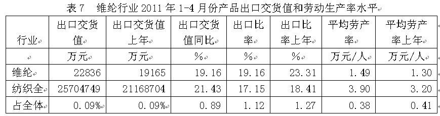 從行業(yè)產(chǎn)品出口交貨值和勞動(dòng)生產(chǎn)率水平看,2011年1-4月份維綸行業(yè)產(chǎn)品出口交貨值為2.28億元,占紡織全行業(yè)的0.09%;出口交貨值比上年同期增加19.16%;該行業(yè)產(chǎn)品出口比率(出口交貨值/工業(yè)銷售產(chǎn)值)為19.16%,而上年同期為23.31%,表明該行業(yè)產(chǎn)品出口狀況較好;從勞動(dòng)生產(chǎn)率的水平看,2011年1-4月份維綸行業(yè)平均勞產(chǎn)率(工業(yè)增加值/從業(yè)人數(shù))為1.49萬元/人,而上年同期為1.30萬元/人,表明該行業(yè)勞動(dòng)生產(chǎn)率的實(shí)際水平較為理想。