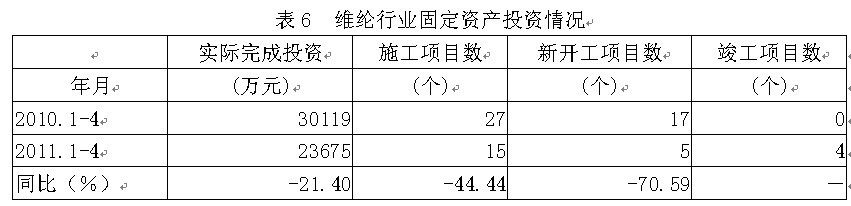 據(jù)國家統(tǒng)計(jì)局公布的數(shù)據(jù),2011年1-4月份維綸行業(yè)實(shí)際完成投資額2.37億元,同比減少21.40%;當(dāng)年以來到目前為止施工項(xiàng)目總數(shù)為15個(gè),同比減少44.44%;其中新開工項(xiàng)目數(shù)5個(gè),同比減少70.59%;截至4月底為止,已實(shí)現(xiàn)竣工項(xiàng)目數(shù)4個(gè),占施工項(xiàng)目總數(shù)的26.67%,表明該行業(yè)投資項(xiàng)目進(jìn)展較好。