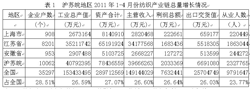 據(jù)國家統(tǒng)計局公布的數(shù)據(jù),2011年1-4月份我國滬蘇皖兩省一市(上海市、江蘇省、安徽?。┘徔棶a(chǎn)業(yè)鏈(從紡織上游原料到下游服裝)規(guī)模以上企業(yè)數(shù)量為10062家,占全國總數(shù)的28.51%;工業(yè)總產(chǎn)值為4079.24億元,占26.59%;資產(chǎn)合計為7843.66億元,占27.07%;主營收入為3966.63億元,占26.60%;利潤總額為203.34億元,占26.64%;出口交貨值為669.11億元,占26.03%;從業(yè)人數(shù)為232.78萬人,占23.77%。由此可見,滬蘇皖地區(qū)紡織產(chǎn)業(yè)鏈總產(chǎn)值、總資產(chǎn)、主營收入、利潤總額、出口和就業(yè)均給全國作出了巨大的貢獻。