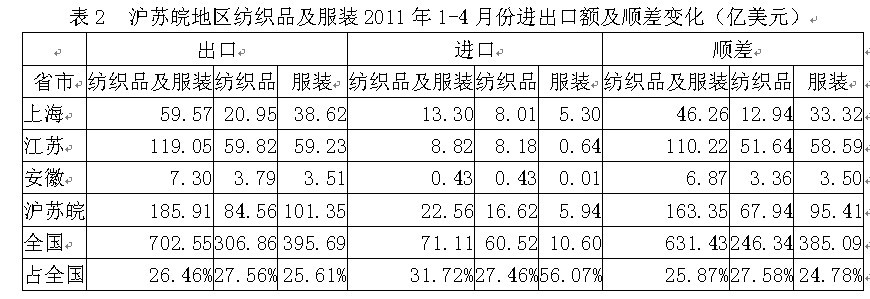 我國滬蘇皖三地2011年1-4月份紡織品及服裝出口額為185.91億美元,占全國紡織品服裝出口總額的26.46%,其中紡織品出口額為84.56億美元,占全國27.56%,服裝出口額為101.35億美元,占全國25.61%;在進口方面,滬蘇皖三地紡織品及服裝進口額為22.56億美元,占全國紡織品服裝進口總額的31.72%,其中紡織品進口額為16.62億美元,占全國27.46%,服裝進口額為5.94億美元,占全國56.07%;顯示我國滬蘇皖地區(qū)紡織品服裝出口總額遠高于進口總額,順差明顯,表明該地區(qū)紡織品服裝在國際市場上競爭力較強。