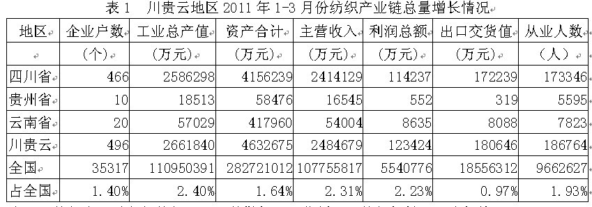 據(jù)國家統(tǒng)計局公布的數(shù)據(jù),2011年1-3月份我國川貴云三省(四川省、貴州省、云南?。┘徔棶a(chǎn)業(yè)鏈(從紡織上游原料到下游服裝)規(guī)模以上企業(yè)數(shù)量為496家,占全國總數(shù)的1.40%;工業(yè)總產(chǎn)值為266.18億元,占2.40%;資產(chǎn)合計為463.27億元,占1.64%;主營收入為248.47億元,占2.31%;利潤總額為12.34億元,占2.23%;出口交貨值為18.06億元,占0.97%;從業(yè)人數(shù)為18.68萬人,占1.93%。由此可見,川貴云地區(qū)紡織產(chǎn)業(yè)鏈總產(chǎn)值、總資產(chǎn)、主營收入、利潤總額、出口和就業(yè)均給全國作出了一定的貢獻。