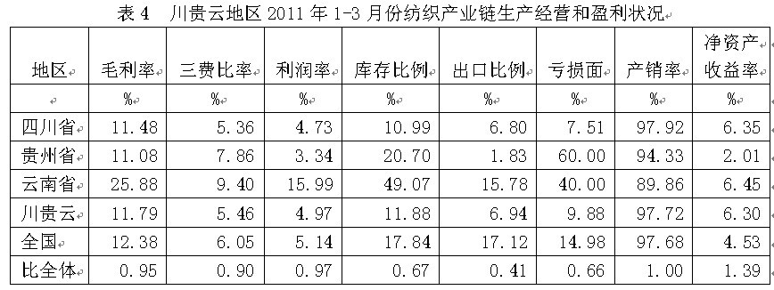 從生產(chǎn)經(jīng)營和盈利狀況看,川貴云紡織產(chǎn)業(yè)鏈毛利率2011年1-3月份為11.79%,為全國平均數(shù)的0.95倍,三費比率(營業(yè)、管理和財務(wù)費用率之和)為5.46%,為全國平均數(shù)的0.90倍,利潤率為4.97%,為全國平均數(shù)的0.97倍;庫存比率為11.88%,為全國平均數(shù)的0.67倍;出口比例為6.94%,為全國平均數(shù)的0.41倍;企業(yè)虧損面為9.88%,為全國平均數(shù)的0.66倍。由此可見,川貴云地區(qū)的盈利狀況接近于全國紡織產(chǎn)業(yè)鏈的平均水平。