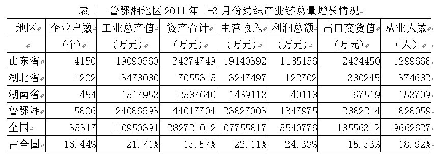 據(jù)國(guó)家統(tǒng)計(jì)局公布的數(shù)據(jù),2011年1-3月份我國(guó)魯鄂湘三?。ㄉ綎|省、湖北省、湖南?。┘徔棶a(chǎn)業(yè)鏈(從紡織上游原料到下游服裝)規(guī)模以上企業(yè)數(shù)量為5806家,占全國(guó)總數(shù)的16.44%;工業(yè)總產(chǎn)值為2408.67億元,占21.71%;資產(chǎn)合計(jì)為4401.77億元,占15.57%;主營(yíng)收入為2382.70億元,占22.11%;利潤(rùn)總額為134.80億元,占24.33%;出口交貨值為288.22億元,占15.53%;從業(yè)人數(shù)為182.81萬(wàn)人,占18.92%。由此可見,魯鄂湘地區(qū)紡織產(chǎn)業(yè)鏈總產(chǎn)值、總資產(chǎn)、主營(yíng)收入、利潤(rùn)總額、出口和就業(yè)均給全國(guó)作出了巨大的貢獻(xiàn)。