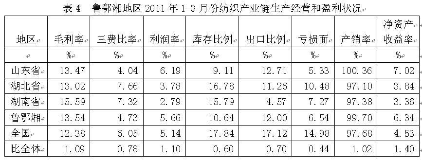 從生產(chǎn)經(jīng)營(yíng)和盈利狀況看,魯鄂湘紡織產(chǎn)業(yè)鏈毛利率2011年1-3月份為13.54%,為全國(guó)平均數(shù)的1.09倍,三費(fèi)比率(營(yíng)業(yè)、管理和財(cái)務(wù)費(fèi)用率之和)為4.73%,為全國(guó)平均數(shù)的0.78倍,利潤(rùn)率為5.66%,為全國(guó)平均數(shù)的1.10倍;庫(kù)存比率為10.64%,為全國(guó)平均數(shù)的0.60倍;出口比例為12.00%,為全國(guó)平均數(shù)的0.70倍;企業(yè)虧損面為6.54%,為全國(guó)平均數(shù)的0.44倍。由此可見,魯鄂湘地區(qū)的盈利狀況接近于全國(guó)紡織產(chǎn)業(yè)鏈的平均水平。