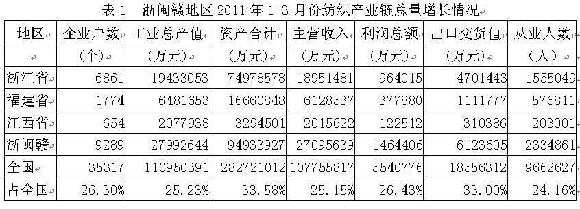 據(jù)國家統(tǒng)計局公布的數(shù)據(jù),2011年1-3月份我國浙閩贛三?。ㄕ憬?、福建省、江西省)紡織產(chǎn)業(yè)鏈(從紡織上游原料到下游服裝)規(guī)模以上企業(yè)數(shù)量為9289家,占全國總數(shù)的26.30%;工業(yè)總產(chǎn)值為2799.26億元,占25.23%;資產(chǎn)合計為9493.39億元,占33.58%;主營收入為2709.56億元,占25.15%;利潤總額為146.44億元,占26.43%;出口交貨值為612.36億元,占33.00%;從業(yè)人數(shù)為233.49萬人,占24.16%。由此可見,浙閩贛地區(qū)紡織產(chǎn)業(yè)鏈總產(chǎn)值、總資產(chǎn)、主營收入、利潤總額、出口和就業(yè)均給全國作出了巨大的貢獻。