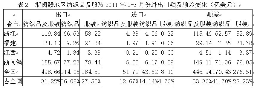 我國浙閩贛三省2011年1-3月份紡織品及服裝出口額為155.67億美元,占全國紡織品服裝出口總額的31.22%,其中紡織品出口額為77.23億美元,占全國36.08%,服裝出口額為78.44億美元,占全國27.56%;在進口方面,浙閩贛三省紡織品及服裝進口額為6.55億美元,占全國紡織品服裝進口總額的12.67%,其中紡織品進口額為6.17億美元,占全國14.14%,服裝進口額為0.39億美元,占全國4.76%;顯示我國浙閩贛地區(qū)紡織品服裝出口總額遠高于進口總額,順差明顯,表明該地區(qū)紡織品服裝在國際市場上競爭力較強。