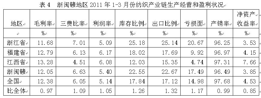 從生產(chǎn)經(jīng)營和盈利狀況看,浙閩贛紡織產(chǎn)業(yè)鏈毛利率2011年1-3月份為12.05%,為全國平均數(shù)的0.97倍,三費比率(營業(yè)、管理和財務(wù)費用率之和)為6.63%,為全國平均數(shù)的1.09倍,利潤率為5.40%,為全國平均數(shù)的1.05倍;庫存比率為22.55%,為全國平均數(shù)的1.26倍;出口比例為22.67%,為全國平均數(shù)的1.32倍;企業(yè)虧損面為17.49%,為全國平均數(shù)的1.17倍。由此可見,浙閩贛地區(qū)的盈利狀況接近于全國紡織產(chǎn)業(yè)鏈的平均水平。