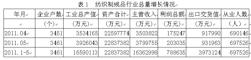 據(jù)國家統(tǒng)計局公布的數(shù)據(jù),2011年1-5月份我國規(guī)模以上紡織制成品行業(yè)(由服用、產(chǎn)業(yè)用和裝飾用三部分紡織終端產(chǎn)品構(gòu)成)企業(yè)數(shù)量為3461家,該行業(yè)實現(xiàn)工業(yè)總產(chǎn)值1659.01億元,同比增加25.86%;資產(chǎn)合計2283.74億元,同比增加18.38%;實現(xiàn)主營收入1636.30億元,同比增加28.58%;完成利潤總額78.86億元,比上年同期增加20.64億元,同比增加35.44%;完成出口交貨值397.3億元,同比增加25.88%;行業(yè)整體從業(yè)人數(shù)69.75萬人,同比增加8.80%。由此可見,紡織制成品行業(yè)總量增長勢頭良好,并為我國經(jīng)濟、財政、出口和就業(yè)作出了重大的貢獻。