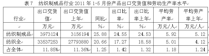 從行業(yè)產(chǎn)品出口交貨值和勞動生產(chǎn)率水平看,2011年1-5月份紡織制成品行業(yè)產(chǎn)品出口交貨值為397.31億元,占紡織全行業(yè)的11.85%;出口交貨值比上年同期增加25.88%;該行業(yè)產(chǎn)品出口比率(出口交貨值/工業(yè)銷售產(chǎn)值)為24.55%,而上年同期為24.53%,表明該行業(yè)產(chǎn)品出口狀況較好;從勞動生產(chǎn)率的水平看,2011年1-5月份紡織制成品行業(yè)平均勞產(chǎn)率(工業(yè)增加值/從業(yè)人數(shù))為5.92萬元/人,而上年同期為5.12萬元/人,表明該行業(yè)勞動生產(chǎn)率的實際水平較為理想。
