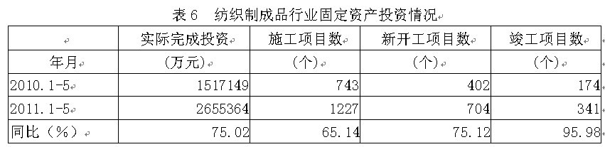 據(jù)國家統(tǒng)計局公布的數(shù)據(jù),2011年1-5月份紡織制成品行業(yè)實際完成投資額265.54億元,同比增加75.02%;當年以來到目前為止施工項目總數(shù)為1227個,同比增加65.14%;其中新開工項目數(shù)704個,同比增加75.12%;截至5月底為止,已實現(xiàn)竣工項目數(shù)341個,同比增加95.98%,占施工項目總數(shù)的27.79%,表明該行業(yè)投資項目進展較好。