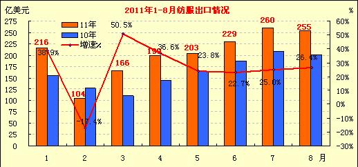 據(jù)海關(guān)統(tǒng)計(jì),2011年1-8月我國(guó)累計(jì)出口紡織品服裝1631.71億美元,同比增幅25.71%。