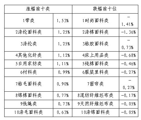 本期價格指數(shù)與年初比上調4.17%,去年同比上調13.50%。本期從一級分類品種中顯示:原料類、服裝面料類、服飾輔料類價格指數(shù)不等量上調,拉動總類價格指數(shù)小幅推升。但坯布類、家紡類價格指數(shù)不等量下跌,相對制約了總類價格指數(shù)的推升幅度。