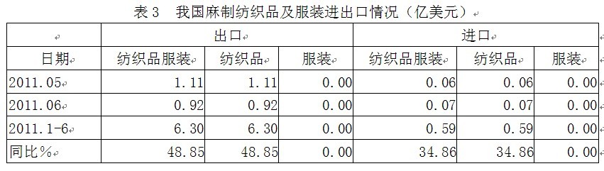 在進(jìn)口方面,我國2011年1-6月份麻制紡織品及服裝進(jìn)口總額0.59億美元,同比增加34.86%,占紡織品及服裝進(jìn)口總額110.03億美元的0.54%;其中1-6月份麻制紡織品進(jìn)口總額0.59億美元,同比增加34.86%,占紡織品進(jìn)口總額93.45億美元的0.64%;顯示中國麻制紡織品和服裝外貿(mào)形勢(shì)較好。