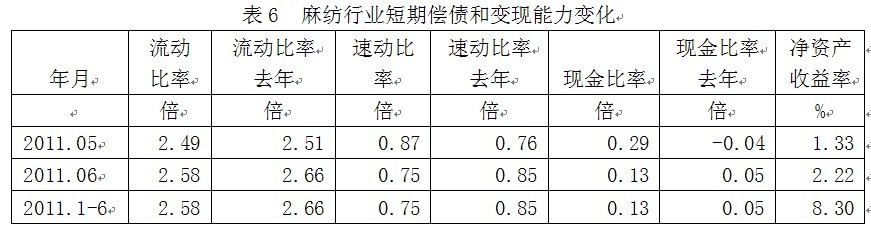 從短期償債和變現(xiàn)能力的變化看,麻紡行業(yè)流動(dòng)比率(流動(dòng)資產(chǎn)/流動(dòng)負(fù)債)2011年1-6月份為2.58倍,而上年同期為2.66倍,流動(dòng)比率較高,表明企業(yè)短期償債能力較強(qiáng);