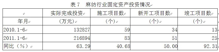 據(jù)國家統(tǒng)計(jì)局公布的數(shù)據(jù),2011年1-6月份麻紡行業(yè)實(shí)際完成投資額21.69億元,同比增加63.29%;當(dāng)年以來到目前為止施工項(xiàng)目總數(shù)為83個(gè),同比增加40.68%;其中新開工項(xiàng)目數(shù)51個(gè),同比增加50.00%;截至6月底為止,已實(shí)現(xiàn)竣工項(xiàng)目數(shù)25個(gè),同比增加92.31%,占施工項(xiàng)目總數(shù)的30.12%,表明該行業(yè)投資項(xiàng)目進(jìn)展較好。