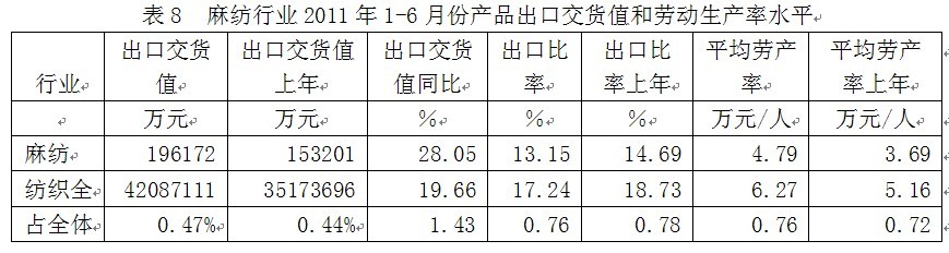 從行業(yè)產(chǎn)品出口交貨值和勞動(dòng)生產(chǎn)率水平看,2011年1-6月份麻紡行業(yè)產(chǎn)品出口交貨值為19.62億元,占紡織全行業(yè)的0.47%;出口交貨值比上年同期增加28.05%;該行業(yè)產(chǎn)品出口比率(出口交貨值/工業(yè)銷售產(chǎn)值)為13.15%,而上年同期為14.69%,表明該行業(yè)產(chǎn)品出口狀況較好;從勞動(dòng)生產(chǎn)率的水平看,2011年1-6月份麻紡行業(yè)平均勞產(chǎn)率(工業(yè)增加值/從業(yè)人數(shù))為4.79萬元/人,而上年同期為3.69萬元/人,表明該行業(yè)勞動(dòng)生產(chǎn)率的實(shí)際水平較為理想。