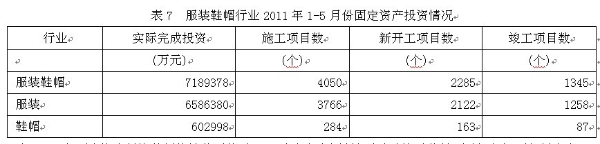 據(jù)國家統(tǒng)計局公布的數(shù)據(jù),2011年1-5月份服裝鞋帽行業(yè)實際完成投資額718.94億元,同比增加87.22%;當(dāng)年以來到目前為止施工項目總數(shù)為4050個,同比增加79.20%;其中新開工項目數(shù)2285個,同比增加86.07%;截至5月底為止,已實現(xiàn)竣工項目數(shù)1345個,同比增加158.16%,占施工項目總數(shù)的33.21%,表明該行業(yè)投資項目進展較好。