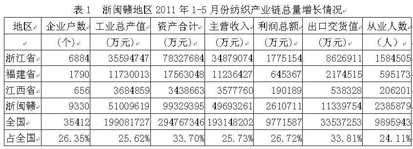 據(jù)國家統(tǒng)計(jì)局公布的數(shù)據(jù),2011年1-5月份我國浙閩贛三?。ㄕ憬?、福建省、江西省)紡織產(chǎn)業(yè)鏈(從紡織上游原料到下游服裝)規(guī)模以上企業(yè)數(shù)量為9330家,占全國總數(shù)的26.35%;工業(yè)總產(chǎn)值為5100.96億元,占25.62%;資產(chǎn)合計(jì)為9932.94億元,占33.70%;主營收入為4969.33億元,占25.73%;利潤總額為261.07億元,占26.72%;出口交貨值為1133.98億元,占33.81%;從業(yè)人數(shù)為238.59萬人,占24.11%。由此可見,浙閩贛地區(qū)紡織產(chǎn)業(yè)鏈總產(chǎn)值、總資產(chǎn)、主營收入、利潤總額、出口和就業(yè)均給全國作出了巨大的貢獻(xiàn)。