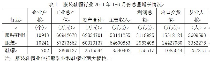 據(jù)國家統(tǒng)計(jì)局公布的數(shù)據(jù),2011年1-6月份我國規(guī)模以上服裝鞋帽行業(yè)完成工業(yè)總產(chǎn)值6094.27億元,其中服裝行業(yè)完成工業(yè)總產(chǎn)值5727.36億元,占服裝鞋帽行業(yè)的93.98%;鞋帽行業(yè)完成366.91億元,占6.02%。