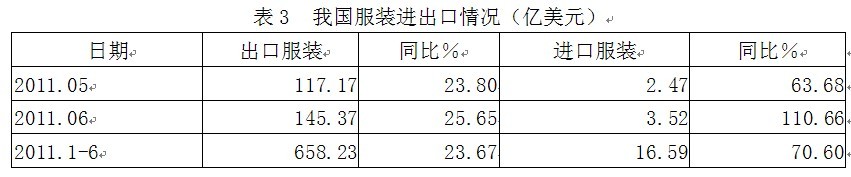根據(jù)中國海關(guān)的統(tǒng)計(jì)數(shù)據(jù),我國2011年1-6月份服裝出口總額658.23億美元,同比增加23.67%,占紡織品及服裝出口總額1145.42億美元的57.47%;1-6月份服裝進(jìn)口總額16.59億美元,同比增加70.60%,占紡織品及服裝進(jìn)口總額110.03億美元的15.08%;顯示中國服裝外貿(mào)形勢(shì)較好。