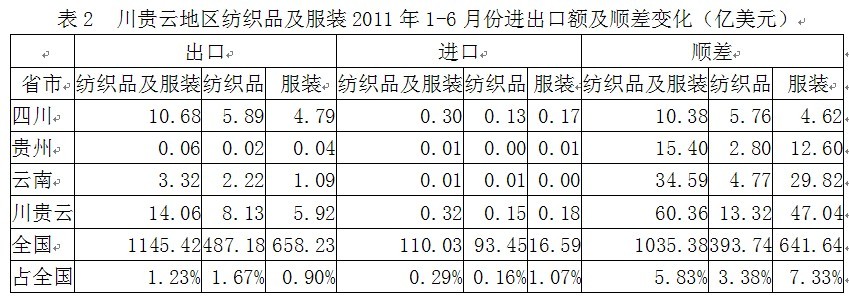 我國川貴云三省2011年1-6月份紡織品及服裝出口額為14.06億美元,占全國紡織品服裝出口總額的1.23%,其中紡織品出口額為8.13億美元,占全國1.67%,服裝出口額為5.92億美元,占全國0.90%;在進口方面,川貴云三省紡織品及服裝進口額為0.32億美元,占全國紡織品服裝進口總額的0.29%,其中紡織品進口額為0.15億美元,占全國0.16%,服裝進口額為0.18億美元,占全國1.07%;顯示我國川貴云地區(qū)紡織品服裝出口總額遠高于進口總額,順差明顯,表明該地區(qū)紡織品服裝在國際市場上競爭力較強。