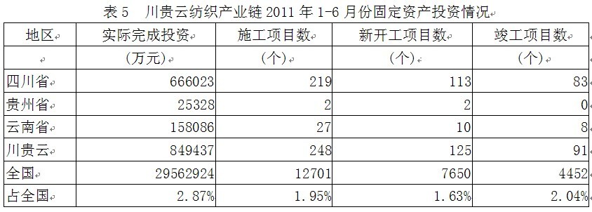 據國家統計局公布的數據,2011年1-6月份川貴云地區(qū)紡織產業(yè)鏈實際完成投資額84.94億元,占全國實際投資總額的2.87%;當年以來到目前為止施工項目總數為248個,占全國施工總數的1.95%;其中新開工項目數125個,占全國新開工項目總數的1.63%;截至6月底為止,已實現竣工項目數91個,占全國已竣工項目總數的2.04%,占該地區(qū)施工項目總數的36.69%,表明該地區(qū)投資項目進展較好。