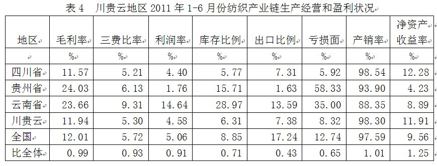 從生產經營和盈利狀況看,川貴云紡織產業(yè)鏈毛利率2011年1-6月份為11.94%,為全國平均數的0.99倍,三費比率(營業(yè)、管理和財務費用率之和)為5.30%,為全國平均數的0.93倍,利潤率為4.58%,為全國平均數的0.91倍;庫存比率為6.31%,為全國平均數的0.71倍;出口比例為7.38%,為全國平均數的0.43倍;企業(yè)虧損面為8.32%,為全國平均數的0.65倍。由此可見,川貴云地區(qū)的盈利狀況接近于全國紡織產業(yè)鏈的平均水平。