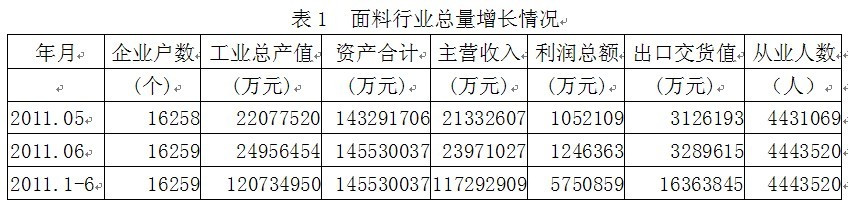 據(jù)國家統(tǒng)計局公布的數(shù)據(jù),2011年1-6月份我國規(guī)模以上面料行業(yè)企業(yè)數(shù)量為16259家,該行業(yè)實現(xiàn)工業(yè)總產(chǎn)值12073億元,同比增加29.98%;資產(chǎn)合計14553億元,同比增加18.00%;實現(xiàn)主營收入11729億元,同比增加29.94%;完成利潤總額575.09億元,比上年同期增加163.83億元,同比增加39.83%;完成出口交貨值1636.38億元,同比增加18.63%;行業(yè)整體從業(yè)人數(shù)444.35萬人,同比增加5.98%。由此可見,面料行業(yè)總量增長勢頭良好,并為我國經(jīng)濟、財政、出口和就業(yè)作出了重大的貢獻。