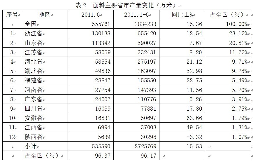 全國面料2011年1-6月份產(chǎn)量合計為283.42億米,比上年同期增加15.36%;其中產(chǎn)量最大的省市是浙江省,產(chǎn)量為65.54億米,為省市龍頭;其次是山東省,產(chǎn)量59.00億米,位居亞軍;然后是江蘇省,產(chǎn)量33.24億米,榮立第三;河北省27.52億米,為第四;湖北省26.31億米,占第五;福建省15.55億米,位居第六;接下來是河南省14.74億米,為第七;廣東省11.08億米,占第八;四川省7.79億米,位居第九;安徽省5.07億米,為第十名;江西省3.70億米,居第11名;陜西省3.03億米,榮立第12名。上述12大省市2011年1-6月份產(chǎn)量合計為272.58億米,占全國2011年1-6月份總產(chǎn)量的96.17%。