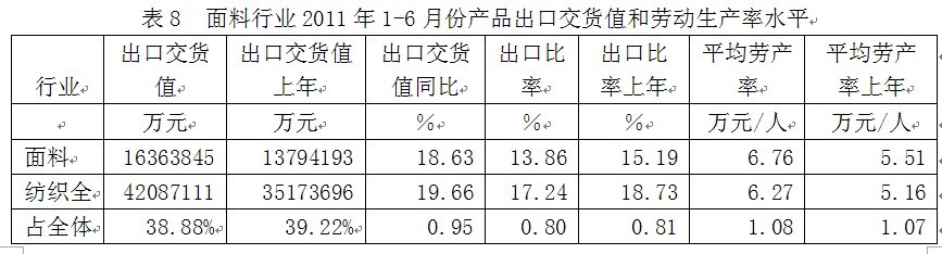 從行業(yè)產(chǎn)品出口交貨值和勞動生產(chǎn)率水平看,2011年1-6月份面料行業(yè)產(chǎn)品出口交貨值為1636.38億元,占紡織全行業(yè)的38.88%;出口交貨值比上年同期增加18.63%;該行業(yè)產(chǎn)品出口比率(出口交貨值/工業(yè)銷售產(chǎn)值)為13.86%,而上年同期為15.19%,表明該行業(yè)產(chǎn)品出口狀況較好;從勞動生產(chǎn)率的水平看,2011年1-6月份面料行業(yè)平均勞產(chǎn)率(工業(yè)增加值/從業(yè)人數(shù))為6.76萬元/人,而上年同期為5.51萬元/人,表明該行業(yè)勞動生產(chǎn)率的實際水平較為理想。