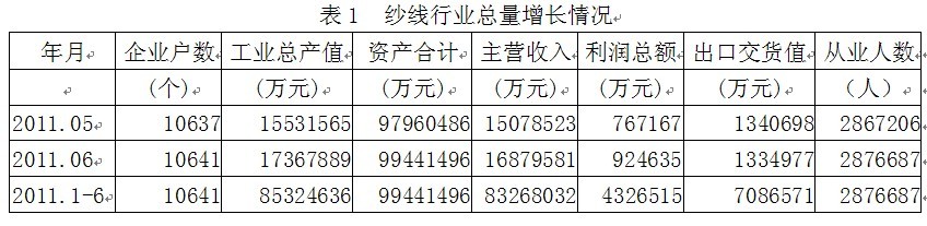 據(jù)國家統(tǒng)計(jì)局公布的數(shù)據(jù),2011年1-6月份我國規(guī)模以上紗線行業(yè)企業(yè)數(shù)量為10641家,該行業(yè)實(shí)現(xiàn)工業(yè)總產(chǎn)值8532億元,同比增加33.30%;資產(chǎn)合計(jì)9944億元,同比增加18.60%;實(shí)現(xiàn)主營收入8327億元,同比增加33.03%;完成利潤總額432.65億元,比上年同期增加139.10億元,同比增加47.39%;完成出口交貨值708.66億元,同比增加19.40%;行業(yè)整體從業(yè)人數(shù)287.67萬人,同比增加6.75%。由此可見,紗線行業(yè)總量增長勢(shì)頭良好,并為我國經(jīng)濟(jì)、財(cái)政、出口和就業(yè)作出了重大的貢獻(xiàn)。