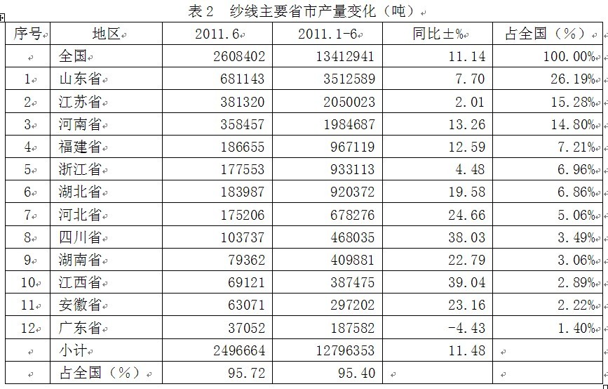 從2011年6月份的情況看,全國紗當(dāng)月總產(chǎn)量為260.84萬噸,上述12大省市的當(dāng)月產(chǎn)量合計(jì)為249.67萬噸,占全國當(dāng)月總產(chǎn)量的95.72%;由此可見,我國前12大省市的紗產(chǎn)量約占全國總產(chǎn)量的絕大部分。