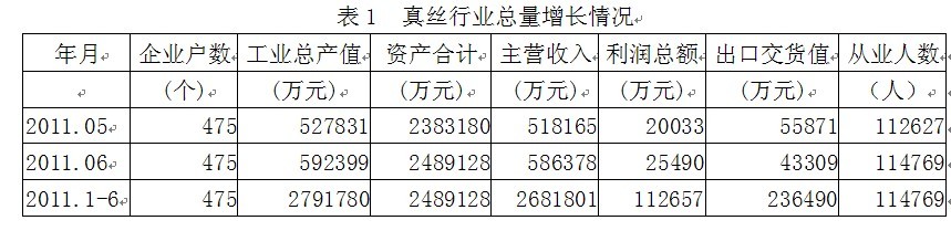 據(jù)國家統(tǒng)計(jì)局公布的數(shù)據(jù),2011年1-6月份我國規(guī)模以上真絲行業(yè)企業(yè)數(shù)量為475家,該行業(yè)實(shí)現(xiàn)工業(yè)總產(chǎn)值279.18億元,同比增加35.78%;資產(chǎn)合計(jì)248.91億元,同比增加17.97%;實(shí)現(xiàn)主營收入268.18億元,同比增加36.21%;完成利潤總額11.27億元,比上年同期增加4.85億元,同比增加75.48%;完成出口交貨值23.6億元,同比增加25.65%;行業(yè)整體從業(yè)人數(shù)11.48萬人,同比增加3.57%。由此可見,真絲行業(yè)總量增長勢頭良好,并為我國經(jīng)濟(jì)、財(cái)政、出口和就業(yè)作出了重大的貢獻(xiàn)。