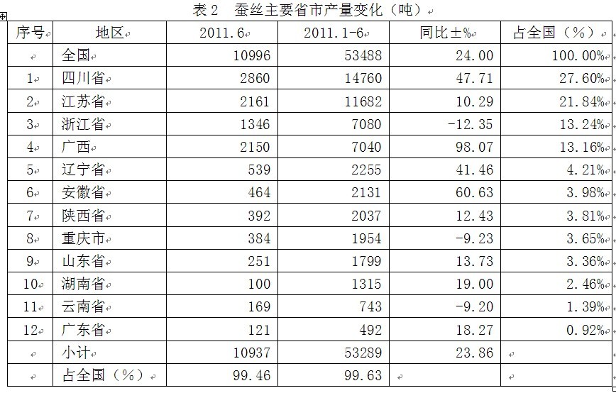 從2011年6月份的情況看,全國蠶絲當(dāng)月總產(chǎn)量為1.10萬噸,上述12大省市的當(dāng)月產(chǎn)量合計(jì)為1.09萬噸,占全國當(dāng)月總產(chǎn)量的99.46%;由此可見,我國前12大省市的蠶絲產(chǎn)量約占全國總產(chǎn)量的絕大部分。