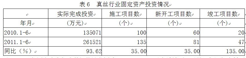 據(jù)國家統(tǒng)計(jì)局公布的數(shù)據(jù),2011年1-6月份真絲行業(yè)實(shí)際完成投資額26.15億元,同比增加93.62%;當(dāng)年以來到目前為止施工項(xiàng)目總數(shù)為135個(gè),同比增加35.00%;其中新開工項(xiàng)目數(shù)81個(gè),同比增加35.00%;截至6月底為止,已實(shí)現(xiàn)竣工項(xiàng)目數(shù)47個(gè),同比增加135.00%,占施工項(xiàng)目總數(shù)的34.81%,表明該行業(yè)投資項(xiàng)目進(jìn)展較好。