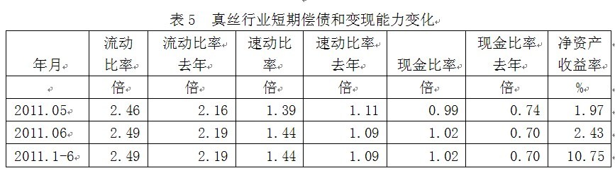 從短期償債和變現(xiàn)能力的變化看,真絲行業(yè)流動(dòng)比率(流動(dòng)資產(chǎn)/流動(dòng)負(fù)債)2011年1-6月份為2.49倍,而上年同期為2.19倍,流動(dòng)比率較高,表明企業(yè)短期償債能力較強(qiáng);