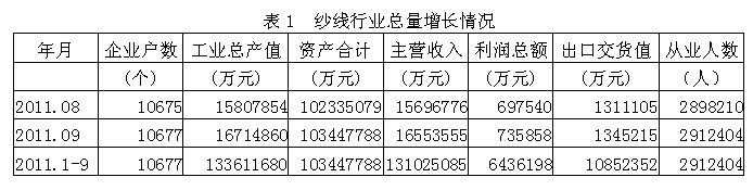 據(jù)國家統(tǒng)計(jì)局公布的數(shù)據(jù),2011年1-9月份我國規(guī)模以上紗線行業(yè)企業(yè)數(shù)量為10677家,該行業(yè)實(shí)現(xiàn)工業(yè)總產(chǎn)值13361億元,同比增加31.78%;資產(chǎn)合計(jì)10345億元,同比增加19.37%;實(shí)現(xiàn)主營收入13103億元,同比增加31.74%;完成利潤總額643.62億元,比上年同期增加165.26億元,同比增加34.55%;完成出口交貨值1085.24億元,同比增加15.71%;行業(yè)整體從業(yè)人數(shù)291.24萬人,同比增加6.59%。由此可見,紗線行業(yè)總量增長勢頭良好,并為我國經(jīng)濟(jì)、財(cái)政、出口和就業(yè)作出了重大的貢獻(xiàn)。