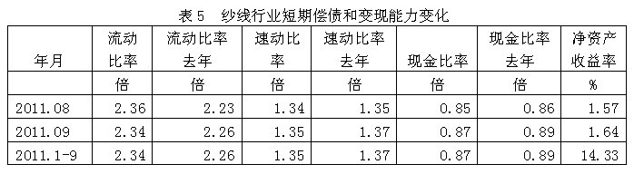 從短期償債和變現(xiàn)能力的變化看,紗線行業(yè)流動比率(流動資產(chǎn)/流動負(fù)債)2011年1-9月份為2.34倍,而上年同期為2.26倍,流動比率較高,表明企業(yè)短期償債能力較強(qiáng);