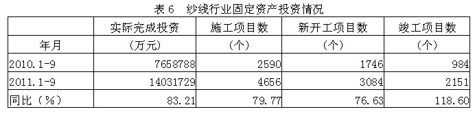 據(jù)國家統(tǒng)計(jì)局公布的數(shù)據(jù),2011年1-9月份紗線行業(yè)實(shí)際完成投資額1403.17億元,同比增加83.21%;當(dāng)年以來到目前為止施工項(xiàng)目總數(shù)為4656個,同比增加79.77%;其中新開工項(xiàng)目數(shù)3084個,同比增加76.63%;截至9月底為止,已實(shí)現(xiàn)竣工項(xiàng)目數(shù)2151個,同比增加118.60%,占施工項(xiàng)目總數(shù)的46.20%,表明該行業(yè)投資項(xiàng)目進(jìn)展較好。