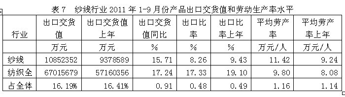 從行業(yè)產(chǎn)品出口交貨值和勞動生產(chǎn)率水平看,2011年1-9月份紗線行業(yè)產(chǎn)品出口交貨值為1085.24億元,占紡織全行業(yè)的16.19%;出口交貨值比上年同期增加15.71%;該行業(yè)產(chǎn)品出口比率(出口交貨值/工業(yè)銷售產(chǎn)值)為8.26%,而上年同期為9.43%,表明該行業(yè)產(chǎn)品出口狀況較好;從勞動生產(chǎn)率的水平看,2011年1-9月份紗線行業(yè)平均勞產(chǎn)率(工業(yè)增加值/從業(yè)人數(shù))為11.42萬元/人,而上年同期為9.24萬元/人,表明該行業(yè)勞動生產(chǎn)率的實(shí)際水平較為理想。