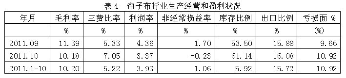 從企業(yè)生產經營和盈利狀況看,簾子布行業(yè)毛利率2011年1-10月份為10.20%,三費比率(營業(yè)、管理和財務費用率之和)為5.22%,利潤率為3.93%,如果剔除非經常性損益的影響,名義稅前利潤率為4.99%;該行業(yè)庫存比率為5.92%,表明產品銷售正常;出口比例為15.72%,表明出口狀況較好;該行業(yè)虧損面為10.92%。由此可見,在簾子布行業(yè)中,生產經營狀況運作得較好。
