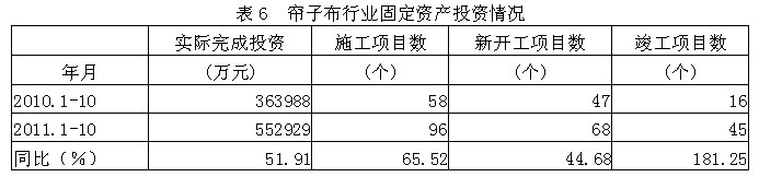 據(jù)國家統(tǒng)計局公布的數(shù)據(jù),2011年1-10月份簾子布行業(yè)實際完成投資額55.29億元,同比增加51.91%;當年以來到目前為止施工項目總數(shù)為96個,同比增加65.52%;其中新開工項目數(shù)68個,同比增加44.68%;截至10月底為止,已實現(xiàn)竣工項目數(shù)45個,同比增加181.25%,占施工項目總數(shù)的46.88%,表明該行業(yè)投資項目進展較好。
