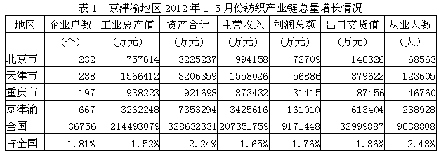 據(jù)國家統(tǒng)計局公布的數(shù)據(jù),2012年1-5月份我國京津渝三大城市(北京市、天津市、重慶市)紡織產(chǎn)業(yè)鏈(從紡織上游原料到下游服裝)規(guī)模以上企業(yè)數(shù)量為667家,占全國總數(shù)的1.81%;工業(yè)總產(chǎn)值為326.22億元,占1.52%;資產(chǎn)合計為735.33億元,占2.24%;主營收入為342.56億元,占1.65%;利潤總額為16.10億元,占1.76%;出口交貨值為61.34億元,占1.86%;從業(yè)人數(shù)為23.89萬人,占2.48%。由此可見,京津渝地區(qū)紡織產(chǎn)業(yè)鏈總產(chǎn)值、總資產(chǎn)、主營收入、利潤總額、出口和就業(yè)均給全國作出了一定的貢獻。
