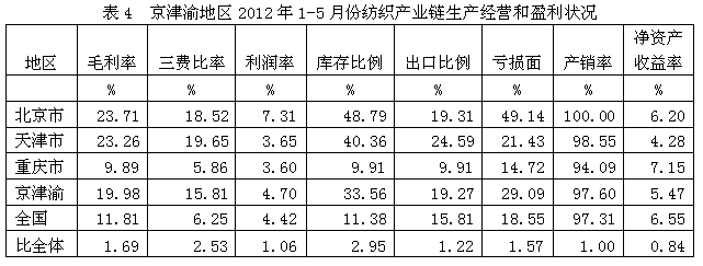 從生產(chǎn)經(jīng)營和盈利狀況看,京津渝紡織產(chǎn)業(yè)鏈毛利率2012年1-5月份為19.98%,為全國平均數(shù)的1.69倍,三費比率(營業(yè)、管理和財務(wù)費用率之和)為15.81%,為全國平均數(shù)的2.53倍,利潤率為4.70%,為全國平均數(shù)的1.06倍;庫存比率為33.56%,為全國平均數(shù)的2.95倍;出口比例為19.27%,為全國平均數(shù)的1.22倍;企業(yè)虧損面為29.09%,為全國平均數(shù)的1.57倍。由此可見,京津渝地區(qū)的盈利狀況接近于全國紡織產(chǎn)業(yè)鏈的平均水平。