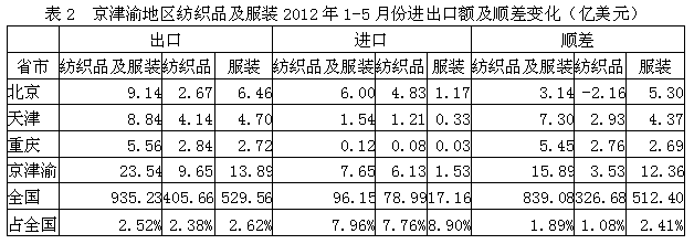 我國京津渝三地2012年1-5月份紡織品及服裝出口額為23.54億美元,占全國紡織品服裝出口總額的2.52%,其中紡織品出口額為9.65億美元,占全國2.38%,服裝出口額為13.89億美元,占全國2.62%;在進口方面,京津渝三地紡織品及服裝進口額為7.65億美元,占全國紡織品服裝進口總額的7.96%,其中紡織品進口額為6.13億美元,占全國7.76%,服裝進口額為1.53億美元,占全國8.90%;顯示我國京津渝地區(qū)紡織品服裝出口總額遠高于進口總額,順差明顯,表明該地區(qū)紡織品服裝在國際市場上競爭力較強。
